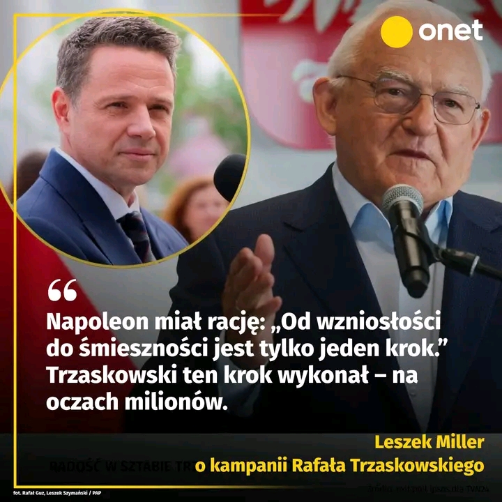 Były premier Leszek Miller podsumował kampanię wyborczą Rafała Trzaskowskiego. We wpisie w mediach społecznościowych wytyka mu liczne błędy. “Napoleon miał rację: »Od wzniosłości do śmieszności jest tylko jeden krok«. Trzaskowski ten krok wykonał — na oczach milionów” — napisał na portalu X. Ostre słowa padły też pod adresem Donalda Tuska i koalicji